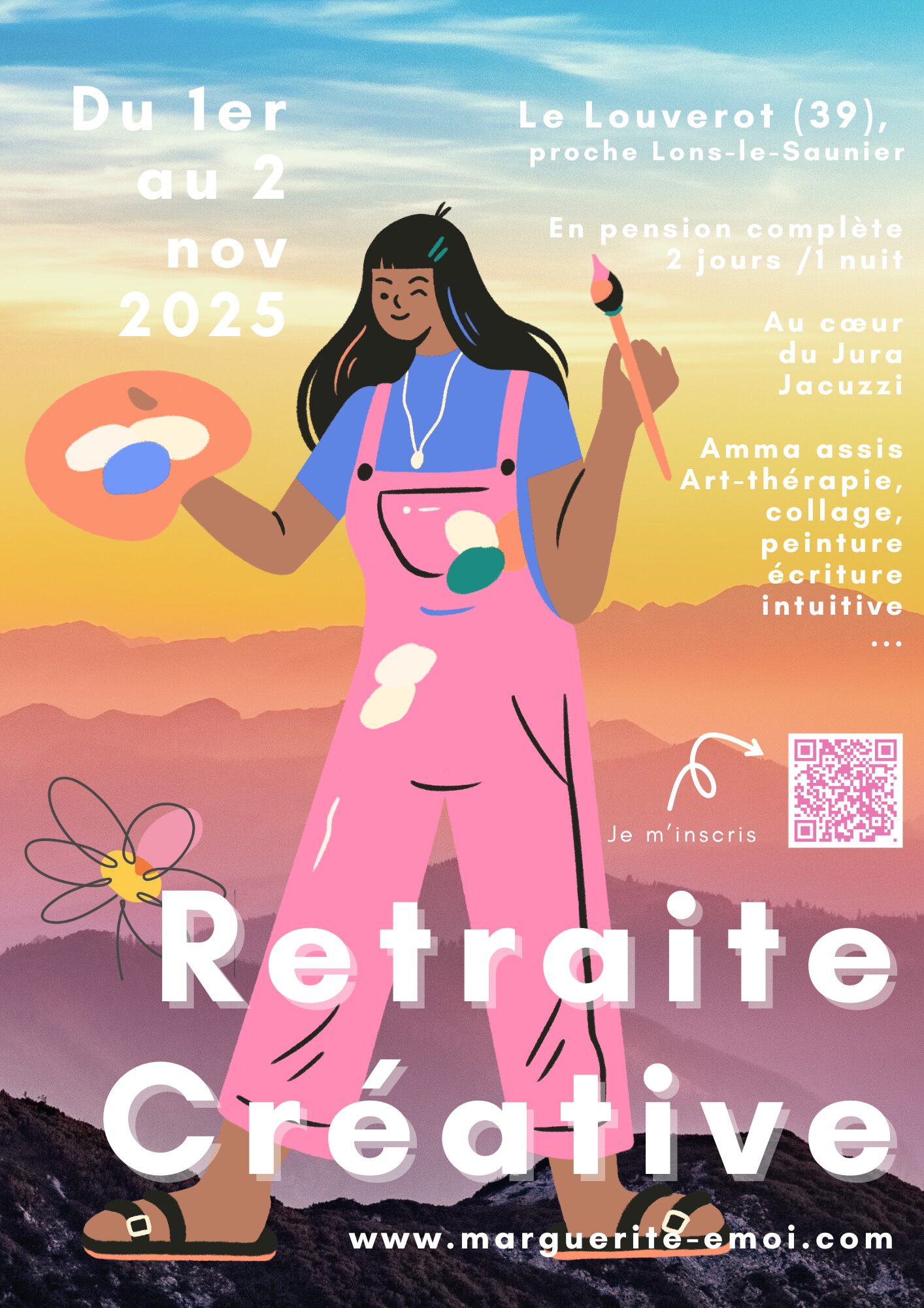 Du 1er au 2 novembre 2025 à Le Louverot (39), proche de Lons-le-Saunier. Amma assis avec Chloé Bigarnet (naturopathe), dessin méditatif, atelier mix-média, loto créatif, brunch, soirée ré-créative. Charmante maison avec jacuzzi, pension complète. Places limitées.