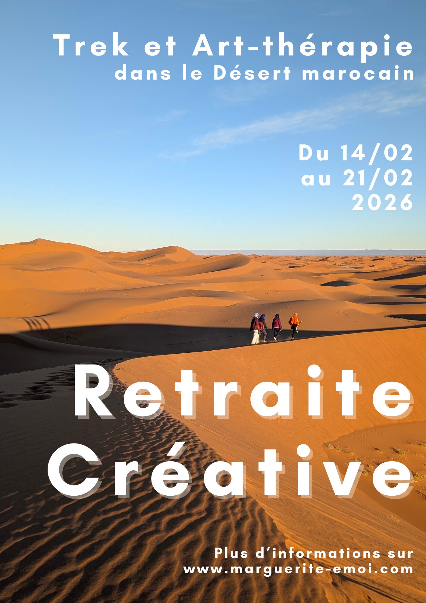 Du samedi 14 au samedi 21 février 2026. Une aventure sensorielle et artistique au cœur du Maroc. Je t’emmène vivre une retraite unique : 7 jours entre randonnée nomade, création intuitive, et connexions profondes dans les dunes dorées du désert marocain. Groupe de 10 personnes maximum.